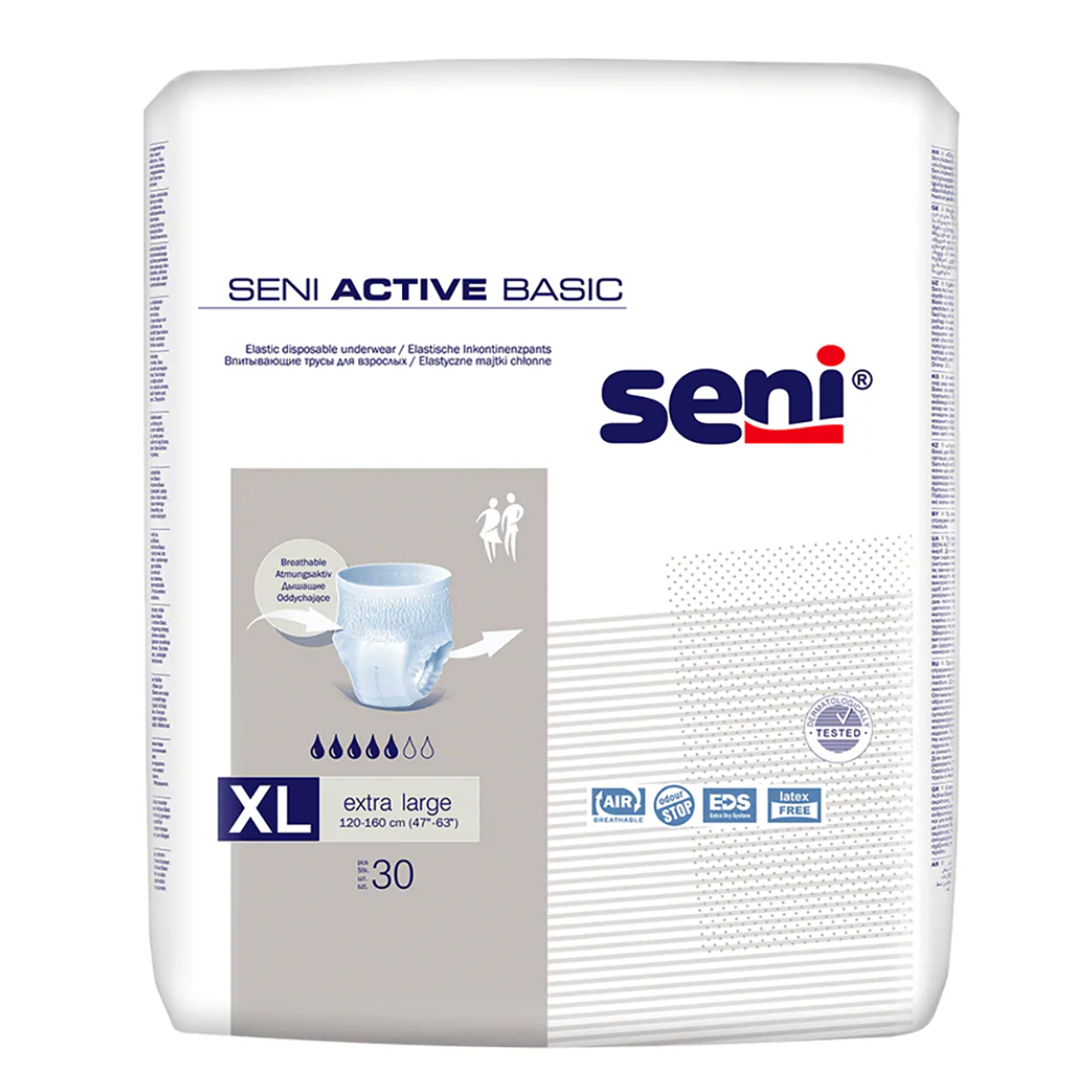 La Seni Active Basic est une culotte absorbante, respirante et élastique, qui s’enfile et se retire comme des sous-vêtements ordinaires. Idéale pour les personnes actives et lors de l’entraînement de la vessie.