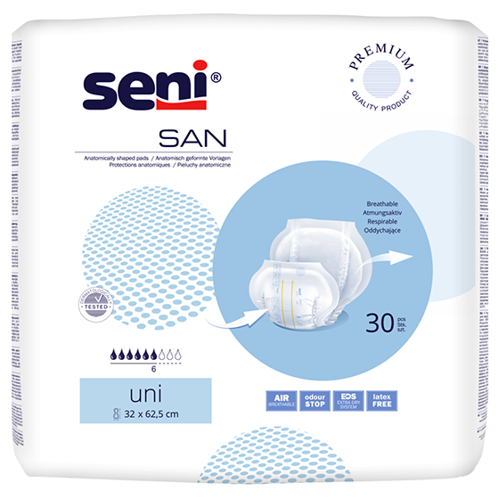 Les protections respirantes de forme anatomique Seni San Uni sont une solution parfaite pour les personnes qui ont des difficultés à ajuster la bonne taille du produit absorbant. Elles n'ont pas d'ailettes latérales ni de rubans de fixation - les protections Seni San se fixent à l'aide de slips de soutien dédiés à usage multiple. Le bon produit est choisi en fonction du pouvoir absorbant requis, et non de la taille de l'utilisateur. Elles peuvent également être utilisées en cas d'incontinence intestinale.
